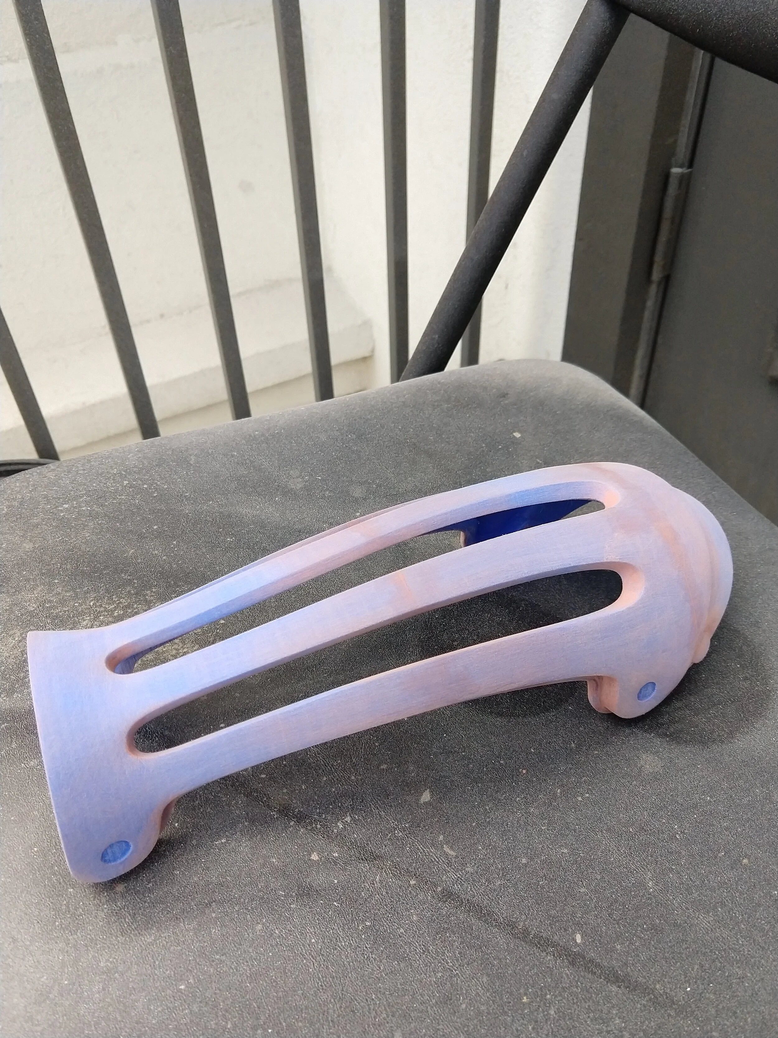 Ever in search for a realistic metal finish, I experimented with graphite powder coating for these pieces. Rubbing graphite powder onto a polished surface creates an incredibly realistic metal finish, however it is a delicate coating that slowly rubs off with handling and easily picks up and shows skin oils. I tested a few different clear coats, and only the water-based coating (Pledge Floor Finish) did not interact with the graphite. I suspect this is because the other coatings were solvent-based paints. These solvents are all hydrocarbon liquids, which are non-polar chemicals. Graphite is pure carbon which is also non-polar so they are prone to interact. Water is a polar molecule, and under the same principle that prevents water and oil from mixing, it didn’t interact with the graphite coating. Likely any other water-based clear coat would work as well.