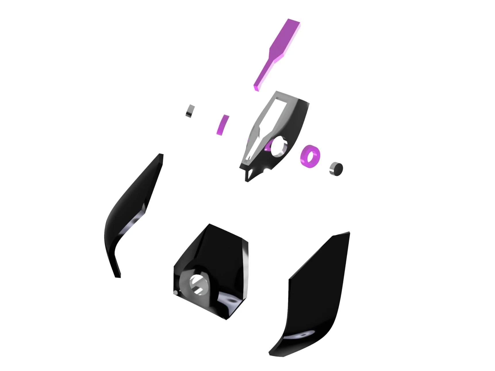 After 3D printing and fully finishing the surface to a 400 grit smoothness, they were molded with silicone rubber (Smooth-On Mold Start 20T). They were then resin cast with Smooth-On Smooth-Cast 325 with a small amount of So-Strong purple and a very small amount of So-Strong white. The transparent purple provides a color tint and the opaque white allows the piece to uniformly diffuse LED backlighting.