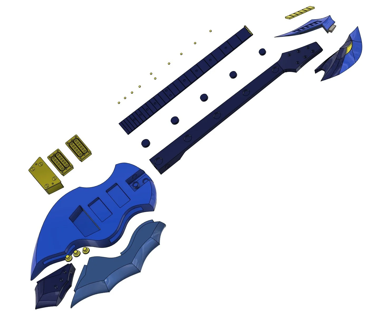 Yasu’s guitar was modeled in Autodesk Fusion 360 using reference images from the anime as well as several references of real guitars. The main body was subdivided into the three natural sections - the large central body, the side “fin” shape, and the bottom small tail shape. Each of these has a distinct base color, so separating these makes the painting step much easier. The yellow pegs, bridge plate, and pickup plates were also separated.
